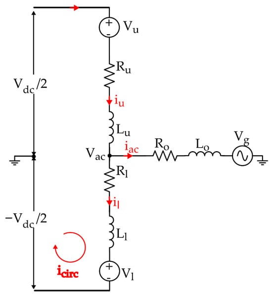 The upper-arm current is defined as positive downward, flowing from the positive DC bus to the AC node. The lower-arm current is also defined as positive downward, flowing from the AC node to the negative DC bus. The AC current is defined as positive, flowing out of the converter into the grid, while the DC current flows from the DC source into the converter and is the sum of the upper and lower arm currents. With these definitions and based on Figure 3, the upper and lower arm currents ( are therefore expressed as: