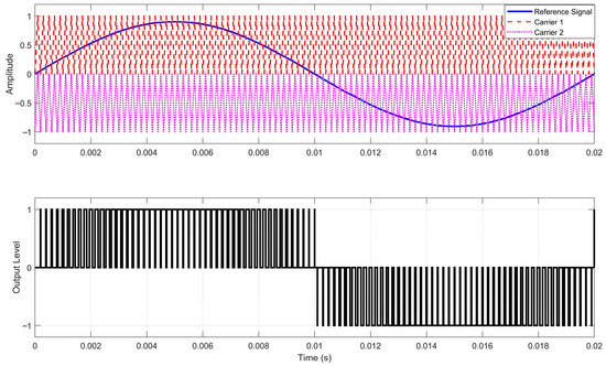 In the proposed MMC control scheme, level-shifted pulse width modulation (LS-PWM) is adopted due to its straightforward implementation and inherent compatibility with capacitor voltage balancing. As shown in Figure 4, LS-PWM employs two level-shifted carrier signals compared against a common sinusoidal reference, where their intersection points determine the submodule switching states, producing the desired three-level output voltage while promoting balanced capacitor utilisation.