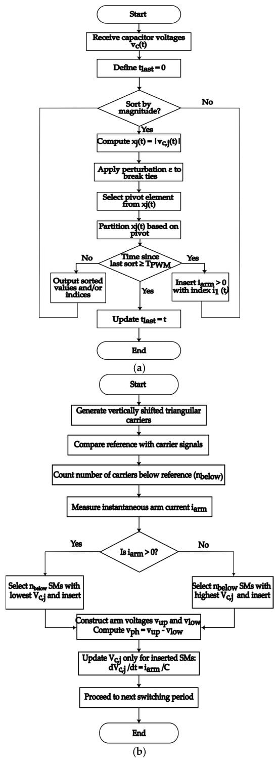 Phase-shifted PWM (PS-PWM) is widely used for submodule balancing due to its even switching distribution, but it often results in higher capacitor ripple than nearest-level modulation (NLM) [21,22]. NLM simplifies balancing but can increase voltage dispersion, while hybrid predictive and radix-based sorting schemes reduce ripple at the cost of significant computational effort [23,24]. Building on these efforts, this work introduces a modified quick-sort algorithm with dynamic pivot selection and adaptive sorting depth, reducing redundant comparisons and improving scalability. Unlike earlier methods, the approach is validated in real time on Typhoon HIL402, demonstrating both novelty and practical feasibility.