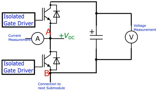 The hardware design of the modular multilevel converter (MMC) was developed with a focus on modularity, scalability, and robustness to ensure reliable operation in power conversion applications. Figure 8 presents the block diagram of the designed half bridge MMC submodule, which is organised into three main building blocks: (a) power stage, (b) gate driver stage, and (c) measurement stage.