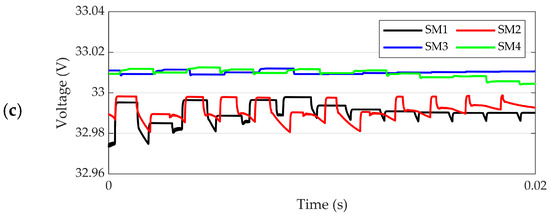 The complete control sequence is illustrated in Figure 6a,b. Capacitor voltages are measured, sorted by magnitude, and perturbation is applied to resolve ties. The resulting indices are tracked, and the insertion logic is executed according to the arm current direction. At each switching cycle, only one submodule is selected for charging or discharging, which prevents overuse of individual SMs and ensures uniform degradation.