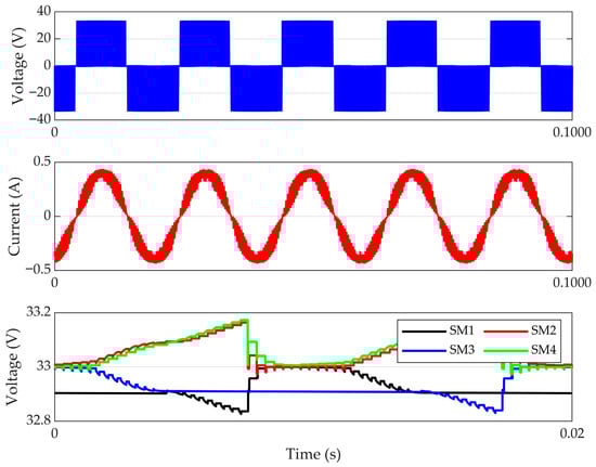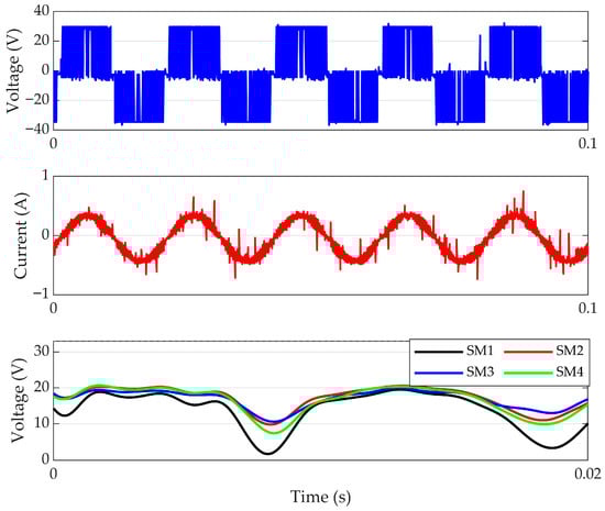 The combined results from MATLAB/Simulink simulation, Typhoon Virtual HIL, and experimental hardware validation are presented in Figure 11, Figure 12 and Figure 13. These show a consistent three-level stepped output voltage, confirming correct MMC operation across all platforms. The simulated waveforms are ideal and noise-free, and the hardware prototype maintains the expected three-level structure but with switching noise and measurement distortion due to practical parasitics. The current output remains sinusoidal in all cases, while the capacitor voltages are effectively balanced, with deviations remaining bounded despite increased ripple in hardware. This progression from clean simulation to noisier but stable hardware waveforms highlights both the robustness of the proposed balancing algorithm and the practical challenges of real implementation.