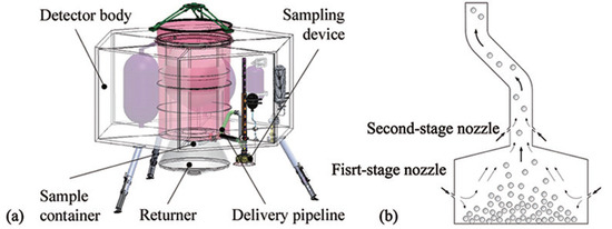 Collectivity scheme of the asteroid sampling device. (a) Model of the asteroid sampling device. (b) Schematic of the asteroid sampling device.