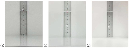 The measurement experiment of the foam ball recovery coefficient is shown in Figure 2. For Figure 2a, the initial height of the foam ball is set to = 10 cm. According to the bounce height of foam ball in Figure 2b, the recovery coefficient of foam ball and geometry can be calculated as = 0.636. According to the bounce height of the foam balls in Figure 2c, the recovery coefficient between foam balls is = 0.604.
