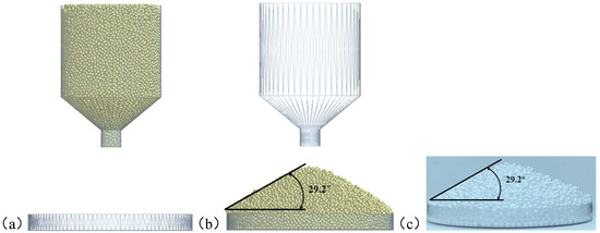 It is difficult to directly measure the particle-to-particle static friction coefficient and rolling friction coefficient. In engineering, the angle between the surface of a stable cone pile formed by the free accumulation of bulk materials under gravity and the horizontal plane, known as the accumulation angle, is measured and compared with the particle-to-particle static friction coefficient and rolling friction coefficient in EDEM simulation software to determine the particle-to-particle contact parameters. In order to measure the static friction coefficient and rolling friction coefficient between particles, virtual calibration experiments were conducted as shown in Figure 3. Figure 3a represents the initial state of the calibration experiment. The particles are stacked through free blanking in the particle factory filled with 4 mm foam balls. This article sets the static friction coefficients between particles to 0.3, 0.4, 0.5, and 0.6, and sets the rolling friction coefficients between particles to 0.02, 0.03, 0.04, and 0.05. A total of 16 virtual calibration experiments were conducted. By comparing with the accumulation angle of the actual foam ball particles in Figure 3c of 29.2°, it is finally determined that the static friction coefficient between particles is 0.5, and the rolling friction coefficient between particles is 0.03.