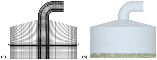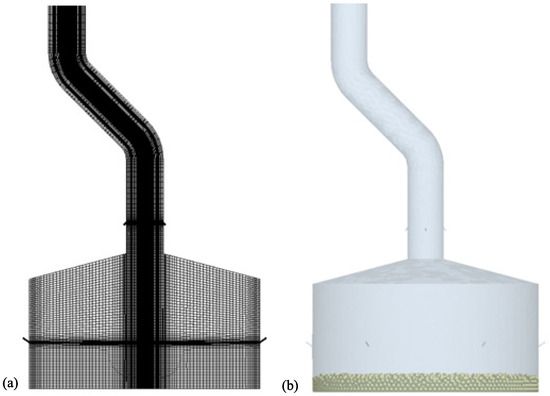 CFD-DEM gas–solid two-phase flow coupling model of the first-stage gas-excitation unit. (a) Structured mesh of the gas-excitation unit, (b) state of the gas-excitation unit at the initial moment.