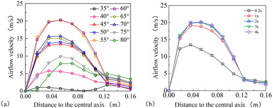 Curve of the vertical component of the flow velocity on the center axis. (a) Airflow velocity corresponding to nozzles at different angles at 4 s, (b) airflow velocity curves at different times when the nozzle angle is 55°.