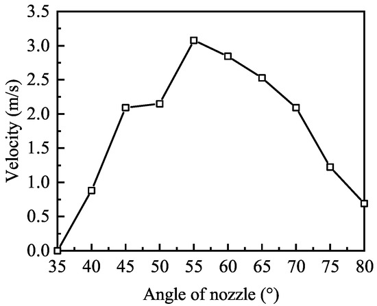 The average vertical velocity of particles along the central axis of the sampling device was extracted from the EDEM software (2025.1) to investigate the effect of the first-stage gas nozzle angle on particle motion. As illustrated in Figure 7, a clear correlation is observed between particle velocity and nozzle inlet angle. When the inlet angle lies within the range of 35°–55°, the particle velocity increases with the angle. At angles below 35°, particles are almost unable to accelerate. When the angle reaches 55°, the vertical velocity attains its maximum, with an average value of 3 . Beyond this point, as the angle increases from 55° to 80°, the particle velocity decreases progressively.