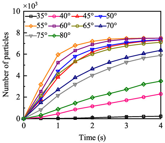 Since the first-stage gas-excitation sampling device with the angle of 55° completed the collection of all sample particles at 4.09 s, the sampling process of 4 s before each nozzle angle was selected for analysis. The comparison of the influence of the first-stage gas nozzle angle on particle collection efficiency is shown in Figure 8. The particle bed was initially affected by the airflow before 1s, and the particle collection volume increased rapidly. The collection rate of the 55° sampling device was the fastest, and 80% of the particle collection was completed at the first second. After 1 s, the collection rate of the nozzle angles of 45°, 50°, 55°, 60°, and 65° continue to decrease and the total particles collected in these sampling devices slowly approach 7500. The sampling device with 55° firstly collects all the particles. The collection rate of the nozzle angles of 35°, 40°, 70°, 75° and 80° are basically unchanged in the first 4s and the number of the particles collected is small.