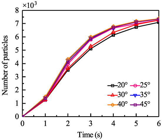 The variation in particle collection with time for different second-stage nozzle angles in the two-stage gas-excitation sampling and delivery device is presented in Figure 11. While the total number of collected particles differs only slightly among the tested angles, collection performance at 25° and 30° is relatively poor compared with the other cases, whereas the device with a nozzle angle of 40° achieves the highest particle yield. At the initial stage of the simulation, sample particles are strongly accelerated by the high-pressure gas, leading to a rapid increase in both particle velocity and collection quantity. For the 40° configuration, approximately 90% of the final collected amount is achieved within the first 4 s. Beyond this point, the accumulation rate gradually decreases, and the growth of total collected particles slows as the simulation progresses. At the end of the simulation, the device with a second-stage nozzle angle of 40° successfully collects a total of 7370 particles.