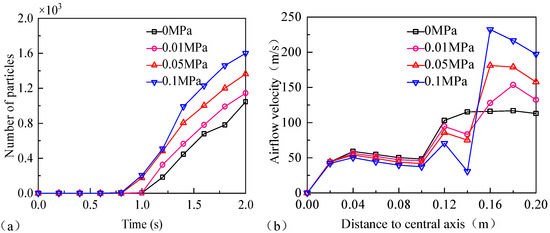 The simulation results are shown in Figure 12. As illustrated in Figure 12a, under the condition that the first-stage gas pressure is set to 0.1 MPa, the second-stage gas pressure of 0.01 MPa achieves the best collection performance, with a total of 1364 particles collected within 2 s. During the period of 0–0.6 s, no particles pass through the sample delivery pipeline. In the time range of 0.8–1 s, the number of collected particles increases proportionally with the second-stage gas pressure, where 0.1 MPa enables the earliest particle collection and yields higher particle counts than the other pressure levels. After 1 s, although the second-stage nozzle accelerates the airflow, the negative airflow generated in the opposite direction hinders the sampling efficiency, and the hindrance effect becomes more pronounced with higher pressures. At 0.05 MPa and 0.1 MPa, the inhibitory effect outweighs the driving effect, resulting in a lower total number of collected particles compared to 0 MPa. This indicates that inappropriate settings of the second-stage nozzle pressure can significantly reduce collection efficiency. As shown in Figure 12b, the section from 0 m to 0.12 m corresponds to the sampling hood region. Due to the negative airflow induced by the second-stage nozzle, the airflow velocity components along the central axis at 0.01 MPa, 0.05 MPa, and 0.1 MPa are lower than those at 0 MPa. At 0.12 m, at the interface between the sampling hood and the sample pipeline, the flow cross-section decreases and the airflow velocity increases. At 0.14 m, where the second-stage nozzle is installed, turbulence occurs at 0.1 MPa, causing a sharp velocity drop. At 0.01 MPa and 0.05 MPa, the velocity decreases slightly, while at 0 MPa it remains nearly stable. In the section from 0.14 m to 0.2 m, the airflow converges to generate higher velocity, and the positive contribution of the second-stage nozzle pressure becomes evident. Within the pipeline, the velocity components increase with the gas pressure.
