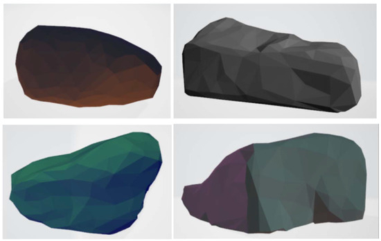 Comprehensive analysis indicates that applying a secondary gas pressure generates a small portion of negative airflow, which reduces the airflow velocity inside the sampling hood. When the pressure is excessively high, turbulence may also occur locally at the secondary nozzle, further impairing the collection efficiency. Meanwhile, the application of secondary pressure enhances the airflow velocity within the sample pipeline, which is beneficial for sample delivery. Therefore, an appropriate pressure ratio between the first-stage and second-stage inlets should be selected to ensure that the driving effect outweighs the hindrance. According to the simulation results, when the first-stage inlet pressure is set to 0.1 MPa, a second-stage pressure of 0.01 MPa is favorable for increasing the total number of collected samples. In reality, asteroid particles exhibit irregular shapes, similar to terrestrial gravel. To capture this characteristic, four types of irregular gravel models were established to simulate the actual particle geometry, as illustrated in Figure 13. The maximum dimension of each particle model was set to 4 mm to satisfy mesh calculation requirements. The model was filled with spherical particles to fit the boundaries, while other physical parameters were kept consistent with those of prototype particles under asteroid conditions.