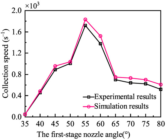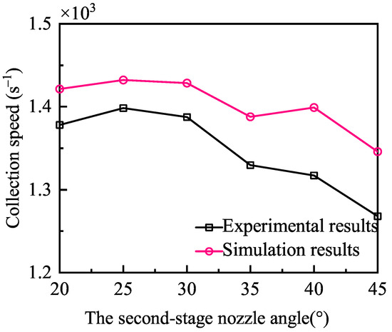 The experimental results show that when the second-stage inlet angle is set at 40°, the sampling efficiency is the highest with an average collection rate of 1399 . The optimal selection result of the second-stage nozzle angle is the same as the simulation results. As shown in Figure 19, the particle collection rate curve was drawn and compared with the simulation results. The two curves of the ground experiment and simulation experiment have a high degree of coincidence with the maximum deviation at 6.2%. It can be seen that the number of sample particles collected in the simulation experiment is slightly higher than that in the ground experiment. Compared with the first-stage gas-excitation sampling device, the collection efficiency of the two-stage gas-excitation sampling and sample delivery device is slightly reduced, but it can still efficiently complete the sample collection and transportation.