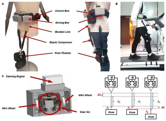 Overall Mechanical Design and Human–Device Coupling of Lower-Limb Hip Exoskeleton: (A) Prototype of the Lower-Limb Hip Exoskeleton Mechanis. (B) Human–Exoskeleton Interface During Walking. (C) Drive Box Structure and Force Transmission Mechanism.