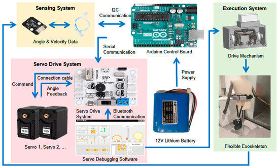An integrated control system (Figure 2), comprising four subsystems—a controller, a sensing unit, a servo drive system, and an execution unit—is introduced in this work to regulate the stiffness of the flexible energy-storing module. The controller is built on an Arduino UNO R3 (Arduino, Elegoo, Shenzhen, China) integrating an ATmega328P microcontroller (Atmel, Microchip Technology Inc., Shanghai, China). With a 16 MHz clock and up to 16 MIPS throughput, it provides sufficient compute for real-time embedded control and system coordination. The sensing unit acquires biomechanical data in real time—joint angles, linear acceleration, and angular velocity—using an MPU6050 inertial measurement unit (IMU) connected via daisy-chained cabling. Communication with the controller uses the IIC protocol, closing the loop for accurate exoskeleton control. The servo drive system executes commands issued directly by the controller or generated from sensor feedback. A dedicated multi-channel servo controller communicates with the Arduino over a UART-based asynchronous serial bus, enabling centralized command distribution to multiple actuators. Angular-position feedback from each servo is continuously monitored to ensure precise actuation.
