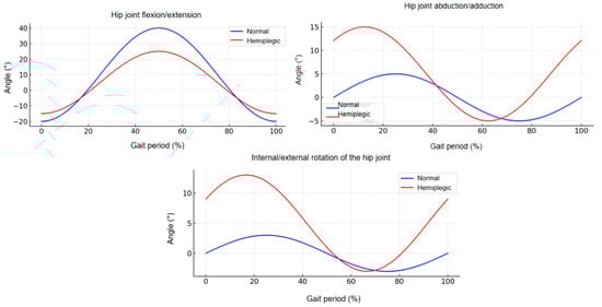 Circumduction gait caused by hemiparesis is one of the most common abnormal gait patterns among patients with central nervous system injuries and represents a key target population for exoskeleton-assisted rehabilitation. In this study, circumduction gait was selected as the representative pathological gait for modeling and analysis, with the goal of enhancing the study’s specificity and clinical relevance by enabling the development of targeted assistance strategies [19]. This type of gait is frequently observed in post-stroke patients and is characterized by the inability of the affected limb to clear the ground during the swing phase, primarily due to muscle weakness, restricted joint mobility, or impaired intermuscular coordination. A lateral arc swing of the affected leg—known as circumduction—typically results from pelvic elevation and hip abduction, which patients employ as a compensatory strategy to achieve forward progression.