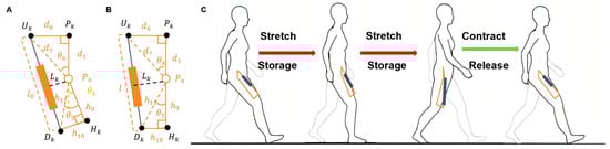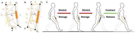 As shown in Figure 6, the diagram illustrates the hip adduction assistance model using an exoskeleton. denotes the rotational center of the hip joint. The upper anchor point is located on the inner side of the thigh’s midline, and the lower anchor point is placed on the knee-binding mechanism. The elastic element is connected between and . is the projection of onto the thigh’s longitudinal axis, and point is the projection of onto the same axis. In Figure 6A, the yellow dashed line represents the extended line of , which is defined as the initial reference position. The angle between the yellow line and represents the abnormal hip abduction angle θk. Figure 6A shows the joint in a state of abnormal abduction, while Figure 6B depicts the corrected, normal alignment after exoskeleton-assisted adduction. The operational process of the elastic element during human walking is illustrated in Figure 6C. During the stance phase, the elastic element is stretched to store energy, which is then released during the swing phase to assist the hip joint in completing the adduction motion.