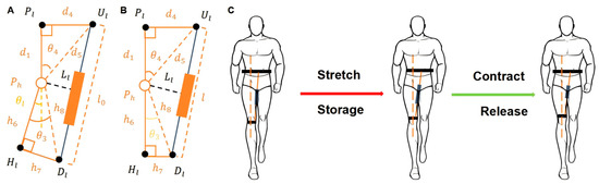 The model for generating hip flexion assistive torque was established by utilizing the energy storage and release characteristics of elastic elements in this paper [23]. As illustrated in Figure 4, the hip exoskeleton assists flexion through a mechanical structure in which Ph denotes the rotational center of the hip joint. The upper anchor point Uh is fixed at the anterior superior iliac spine, while the lower anchor point Dh is located on the upper section of the knee fixation mechanism. The elastic element is connected between Uh and Dh. Point P is the projection of Uh on the torso, and point H is the projection of h on the midline of the thigh. In Figure 4A,B, the yellow dashed line represents the extension of PPh, defined as the initial reference position. The angle between the yellow dashed line and PhH is defined as the hip joint angle θh, with Figure 4A representing positive hip flexion and Figure 4B representing negative hip extension.