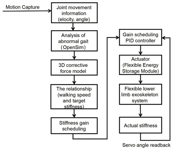 The execution unit integrates the mechanical drive and the flexible exoskeleton interface. Actuation modulates cable tension to adjust the elastic element’s stiffness; forces are transmitted through Bowden cables to the wearable interface, delivering targeted assistive and corrective torques at the lower-limb joints. Collectively, the system enables dynamic support and gait correction during walking.