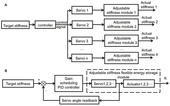 Stiffness Adjustment and Control Strategy for Exoskeleton: (A) Methods for Adjusting the Stiffness of the Exoskeleton; (B) Overall Block Diagram of Stiffness Gain PID Control.