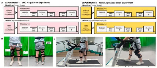 - Group B: After donning the exoskeleton, participants walked on the treadmill at the same speed of 2.5 km/h for 1 min, repeating the walk five times with a 5 min rest between each trial.
