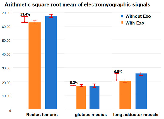 The analysis of EMG signals revealed significant differences between the wearing and non-wearing conditions. The rectus femoris showed the most notable increase in muscle activation with a 21.4% (p < 0.01, shown in Figure 10) difference between the wearing and non-wearing conditions. This suggests that the exoskeleton provides additional assistance to the muscle, likely due to its role in supporting hip flexion and aiding the movement of the lower limbs during walking. The gluteus medius showed a minimal increase in activation, only 0.3% (p < 0.05), indicating that the exoskeleton has little impact on this muscle’s activity. Conversely, the long adductor muscle exhibited a 6.8% (p < 0.05) increase in activation with the exoskeleton, suggesting a moderate effect in aiding the adduction movement during the gait cycle. These results suggest that the exoskeleton assists in redistributing the muscle load, particularly in the major muscle groups involved in walking, which may reduce the effort required by the user.