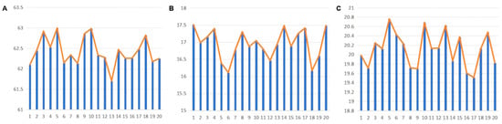 Muscle Activation Levels over 20 Gait Cycles After Wearing the Exoskeleton: (A) Rectus Femoris; (B) Gluteus Medius; (C) Long Adductor. Blue bars indicate muscle activation levels, and orange lines represent the average activation trend.