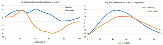 Angle Variation Curves Before and After Wearing the Exoskeleton: (left) Hip Abduction/Adduction Angle; (right) Hip Flexion/Extension Angle.