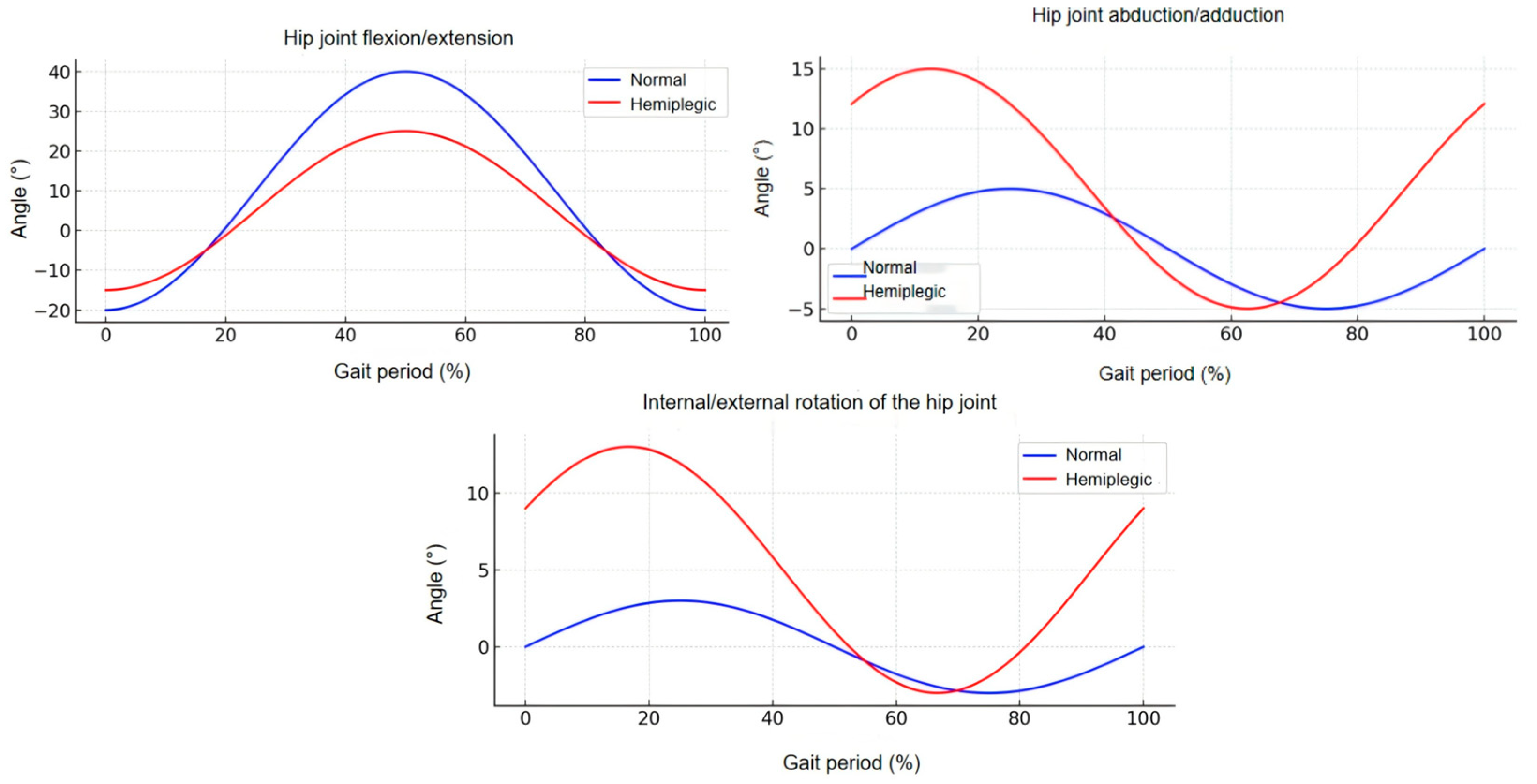 19]. This type of gait is frequently observed in post-stroke patients and is characterized by the inability of the affected limb to clear the ground during the swing phase, primarily due to muscle weakness, restricted joint mobility, or impaired intermuscular coordination. A lateral arc swing of the affected leg—known as circumduction—typically results from pelvic elevation and hip abduction, which patients employ as a compensatory strategy to achieve forward progression.
