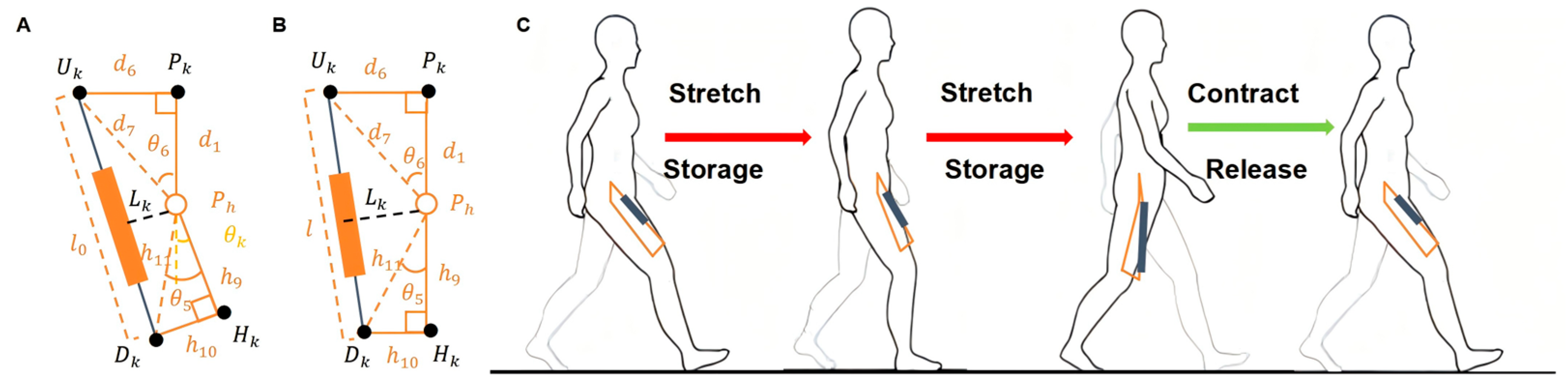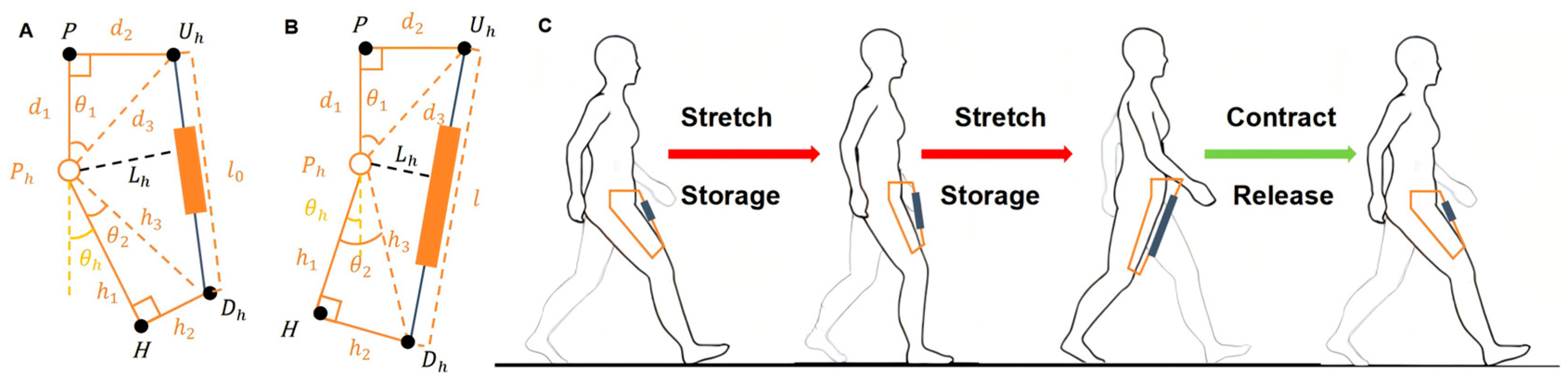 Hip Flexion Assistance Model Based on Exoskeleton Mechanism: (A) Model representation at maximum hip flexion; (B) Model representation at maximum hip extension; (C) Operating principle of the elastic element during flexion assistance. (Ph: hip joint center; Uh: upper anchor point on pelvis; Dh: lower anchor point near knee; P, H: projections used to define hip angle θh; θh: angle between PhH and PPh).