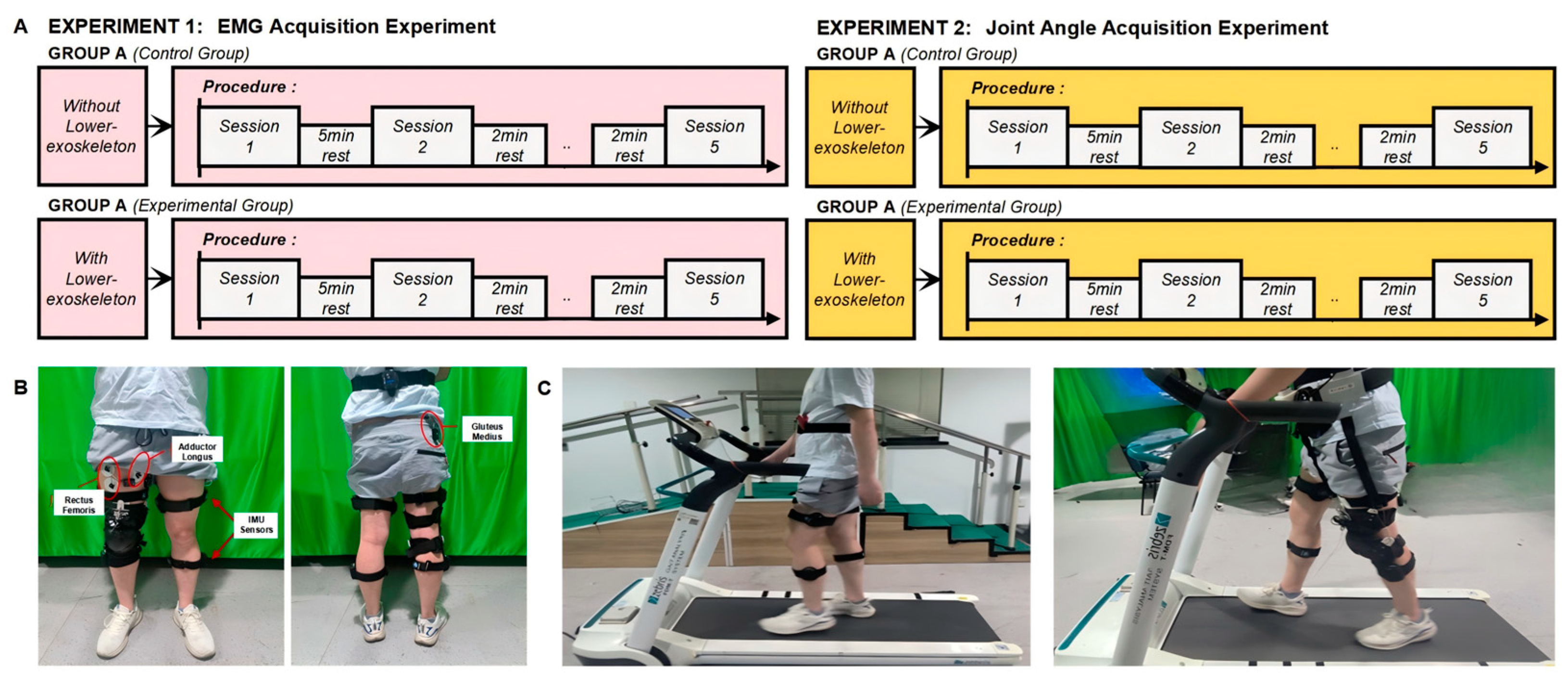 Experimental Setup for Gait Analysis: Walking with and without Exoskeleton Assistance: (A) Experimental Procedure; (B) IMU and EMG Sensor Placement; (C) Experimental Process (Without and with exoskeleton).