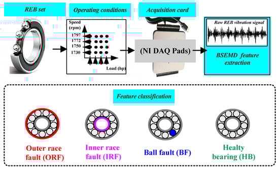 Over the past few decades, a plethora of signal processing methods have been proposed for the detection and diagnosis of bearing faults. Depending on the investigated physical quantity, these methodologies broadly fall into different categories such as vibration analysis, acoustic measurements, temperature monitoring, and wear debris analysis [2]. Among these physical quantities, mechanical vibration analysis stands out as the most immediate, accessible, and information-rich source for understanding phenomena related to REB fault diagnosis [2,3,4]. While vibration analysis is indispensable for extracting crucial diagnostic information, the aforementioned challenges of non-stationarity and nonlinearity characteristics, and the existence of important noise, continue to limit the effectiveness of many conventional approaches proposed in the open literature.