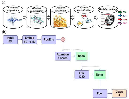 This work aims to propose a new method for online REB fault diagnosis in electrical machines. As shown in Figure 2a, four online steps are proposed: the online vibration signal acquisition step, the BSEMD computation step, the feature extraction step, and the feature classification based on a new Transformer framework. More details about each step are provided in Section 3.