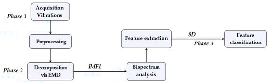 The proposed methodology systematically processes vibration signals through five key stages: (1) acquisition and preprocessing, (2) adaptive signal decomposition, (3) higher-order spectral analysis, (4) discriminative feature extraction, and (5) feature classification.