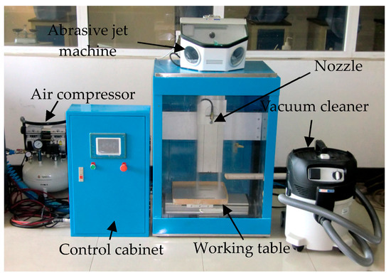 The experiments were conducted using an abrasive air jet setup, as shown in Figure 1. The AAJ setup consists of an air compressor, an abrasive jet machine (Basic Master Abrasive Jet Machine, Renfert GmbH, Hilzingen, Germany), a blasting chamber, a CNC 3-axis guiding system, and a vacuum cleaner. The abrasives are mixed with dehumidified compressed air and fed into the hermetically sealed blasting chamber through a small nozzle. A CNC 3-axis guiding system, with a working area of 200 mm × 200 mm × 300 mm, controls the scanning motion of the nozzle. Dust generated during the experiment is evacuated from the blasting chamber by a vacuum cleaner.