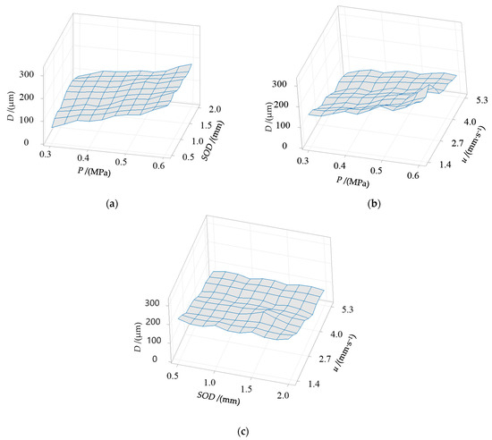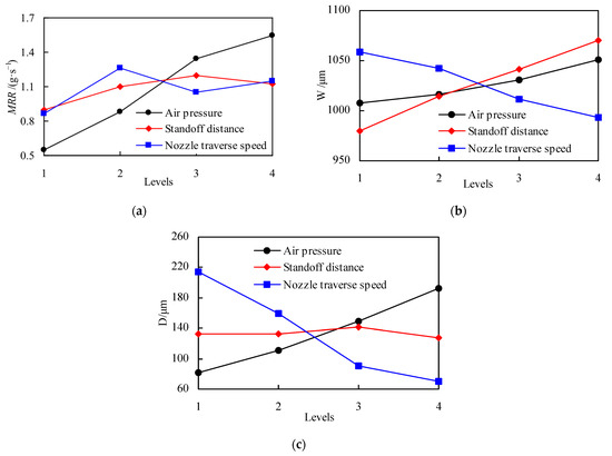 According to the experimental data in this study, D ranges from 26.4 to 322.4 μm. The main effect of process parameters on the machining depth is shown in Figure 3c. It can be seen from the figure that machining depth increases with an increase in air pressure, whereas the traverse speed has a negative effect on the machining depth. The standoff distance appears to have a negligible effect on machining depth.