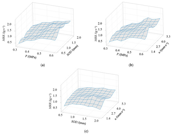 Interactive effect of process parameters on the material removal rate: (a) influence of interaction between air pressure and standoff distance on the material removal rate; (b) influence of interaction between air pressure and nozzle traverse speed on the material removal rate; (c) influence of interaction between standoff distance and nozzle traverse speed on the material removal rate.