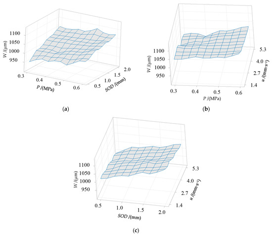 Interactive effect of process parameters on the machining width: (a) influence of interaction between air pressure and standoff distance on the machining width; (b) influence of interaction between air pressure and nozzle traverse speed on the machining width; (c) influence of interaction between standoff distance and nozzle traverse speed on the machining width.