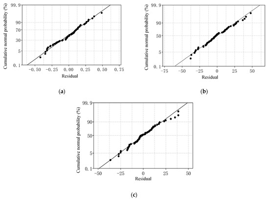 Normal probability plot of residuals for regression models: (a) normal probability plot of residuals for the material removal rate model; (b) normal probability plot of residuals for the machining width model; (c) normal probability plot of residuals for the machining depth model.