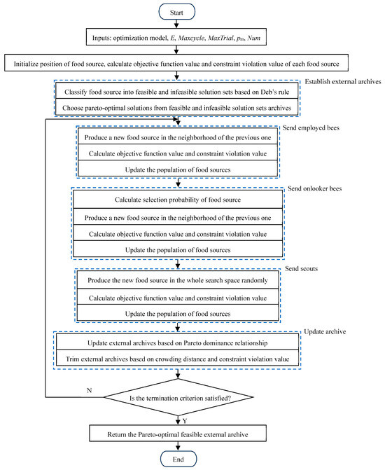 The multi-objective ABC algorithm terminates after a predetermined maximum number of iterations Maxcycle. If the termination criterion is met, the optimization process stops, and the external archive Rpop1 will be output. Otherwise, the process returns to Step 5.3.