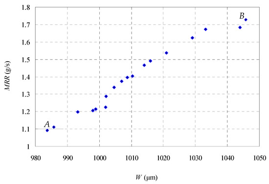 The Pareto fronts are plotted in Figure 9. It can be seen that the minimum W with the minimum MRR can be obtained at point A. On the other hand, the maximum MRR can be obtained at point B, where W is also at its maximum. The points between A and B are also feasible solutions, representing trade-offs between maximizing MRR and minimizing W. These solutions are equally good, and any of them can be selected to achieve optimal objectives. The selection of the optimal solution depends on the engineering requirement and the personal preferences of the operator.