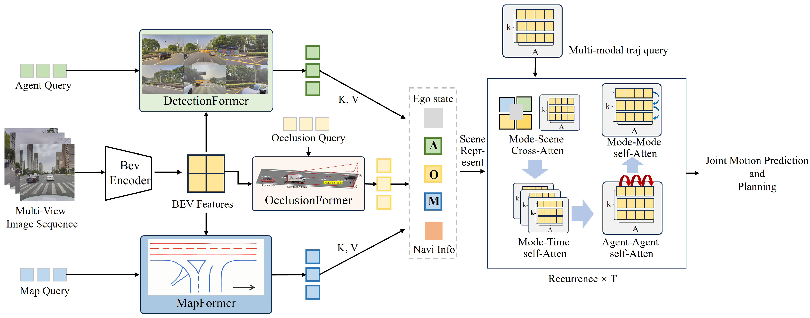 - (1) Mode-to-Scene Cross-Attention: Incorporates scene-level features (e.g., map, occlusion, and historical trajectories) into each mode embedding to enhance environmental awareness