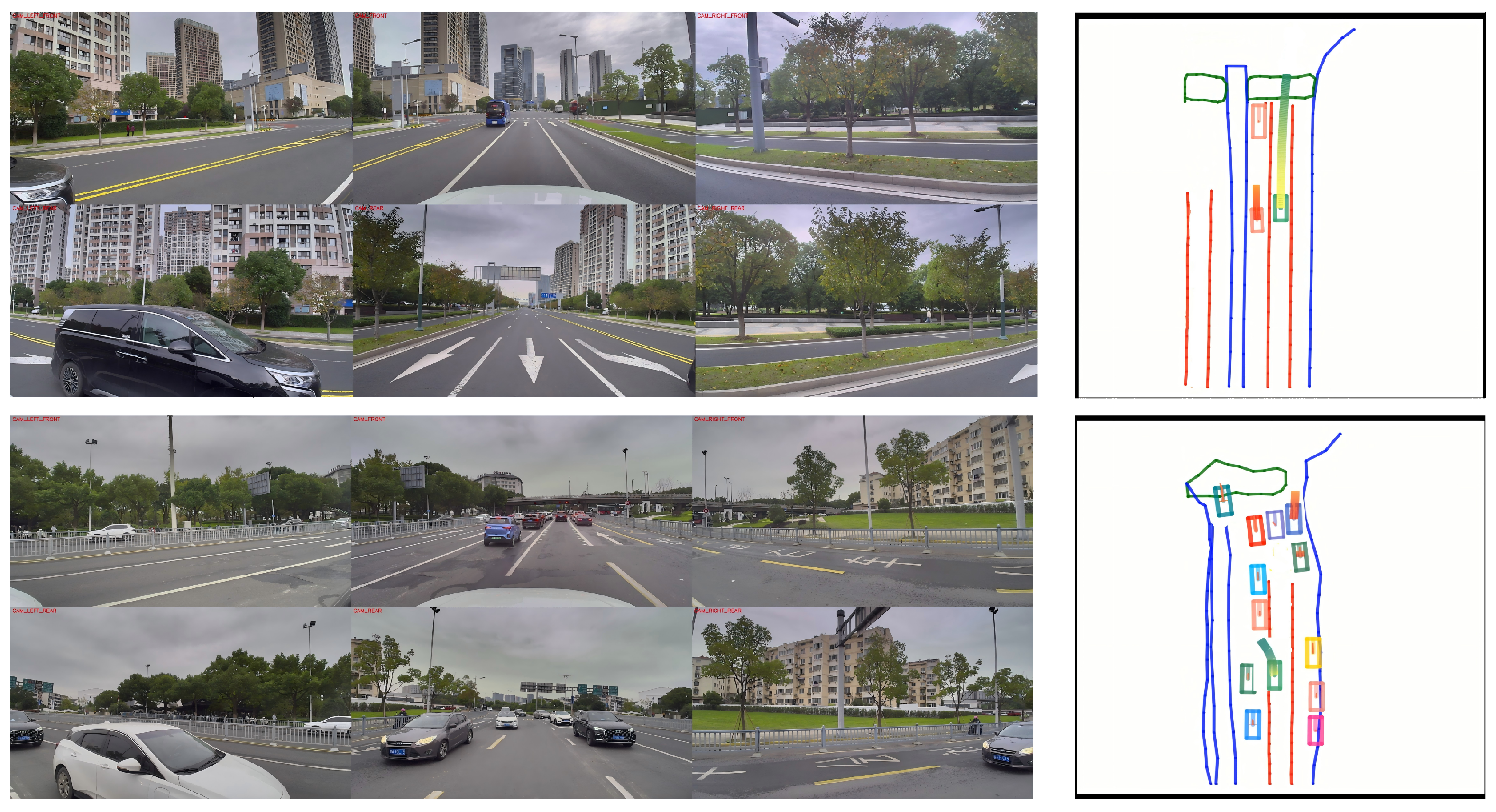 - Map features: , representing vectorized structures such as lane dividers, road boundaries, and crosswalks.