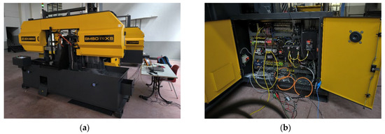 Experimental setup of the band sawing system used in the validation tests: (a) general view of the band sawing machine; (b) control cabinet and measurement connections.