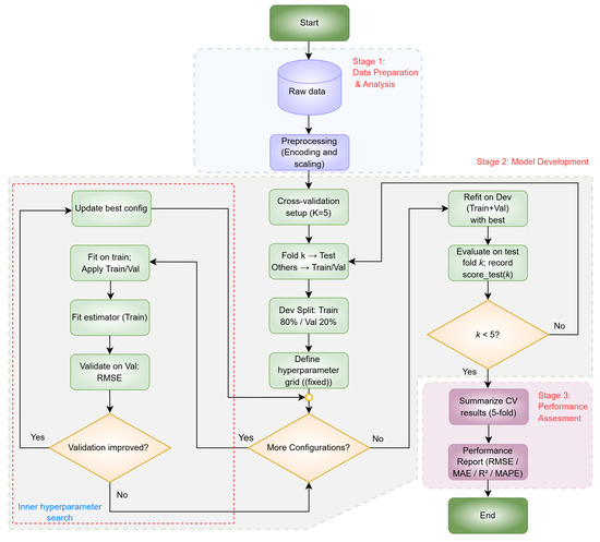 This section covers the most critical stages that shape final predictive performance and provides a systematic evaluation of the generalization capabilities of the investigated models. This evaluation was conducted based on a modeling system founded on nested CV. This framework follows the comprehensive workflow illustrated in Figure 2, which progresses through three main stages: data preparation, model development, and performance evaluation.