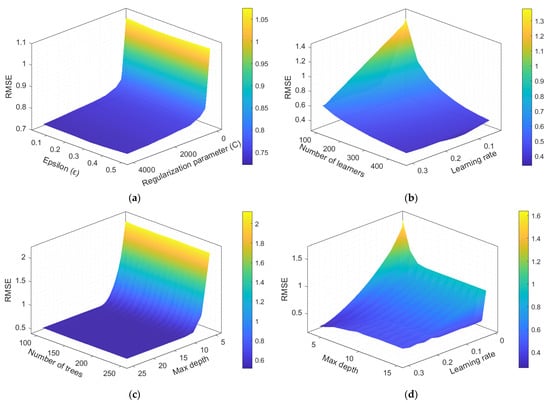 Hyperparameter tuning surfaces for the regression models evaluated in this study: (a) SVR; (b) LSBoost; (c) RFR; (d) XGBoost.