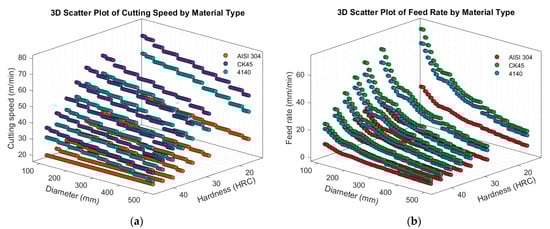 The dataset generation process, structure, and variable definitions are explained in detail in Section 3.1. This section focuses on presenting the statistical properties of the input features and exploring their relationships with the target variables. The input features, material type, hardness (HRC), and diameter (mm), were used to predict cutting speed and feed rate in band sawing operations. Summary statistics for the continuous features are provided in Table 3, while 3D scatter plots in Figure 4 illustrate the combined effects of material properties and geometry on machining behavior.