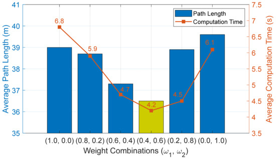 To quantitatively determine the optimal weights for ω1 and ω2, several distinct strategy sets are selected for experimental evaluation. By systematically assessing the influence of varying weight values on both path length and runtime, suitable combinations of weight coefficients are identified, with key results summarized as follows.