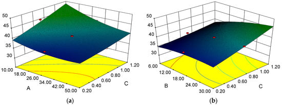 Figure 8a displays the response surface of the interaction between the gravitational coefficient (A) and step length (C) on the running time. When A is 50, increasing C from 0.2 m to 1.2 m results in an 84% reduction in runtime. Fixing C at 0.2 m and increasing A from 10 to 50, the runtime increases by 73%. This indicates that step length significantly affects runtime, with longer steps decreasing the runtime. This is attributed to the acceleration of the path search speed with larger steps, which results in less search time.