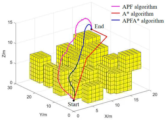 The simulation outcomes of the proposed APFA* algorithm are presented in Figure 12. As indicated in Table 7, the algorithm achieves a path length of 35.8 m and a computation time of 5.64 s—representing a 14.8% reduction compared to the APF method and a 1.1% improvement over the A* algorithm. Although the number of expanded nodes amounts to 179, the method maintains high search efficiency within a short execution time. As depicted in Figure 12, the integration of the attractive and repulsive fields of the APF algorithm into the cost function of the A* algorithm not only prevents UAV oscillation but also enables swift expansion of search nodes while efficiently avoiding obstacles. Furthermore, the path planned by the APFA* algorithm meets the performance constraints and eliminates the need for additional smoothing processing. Comparing the simulation results of the three algorithms, the APFA* algorithm demonstrates superior performance in terms of global planning ability and search efficiency, which indicates the feasibility of the algorithm.